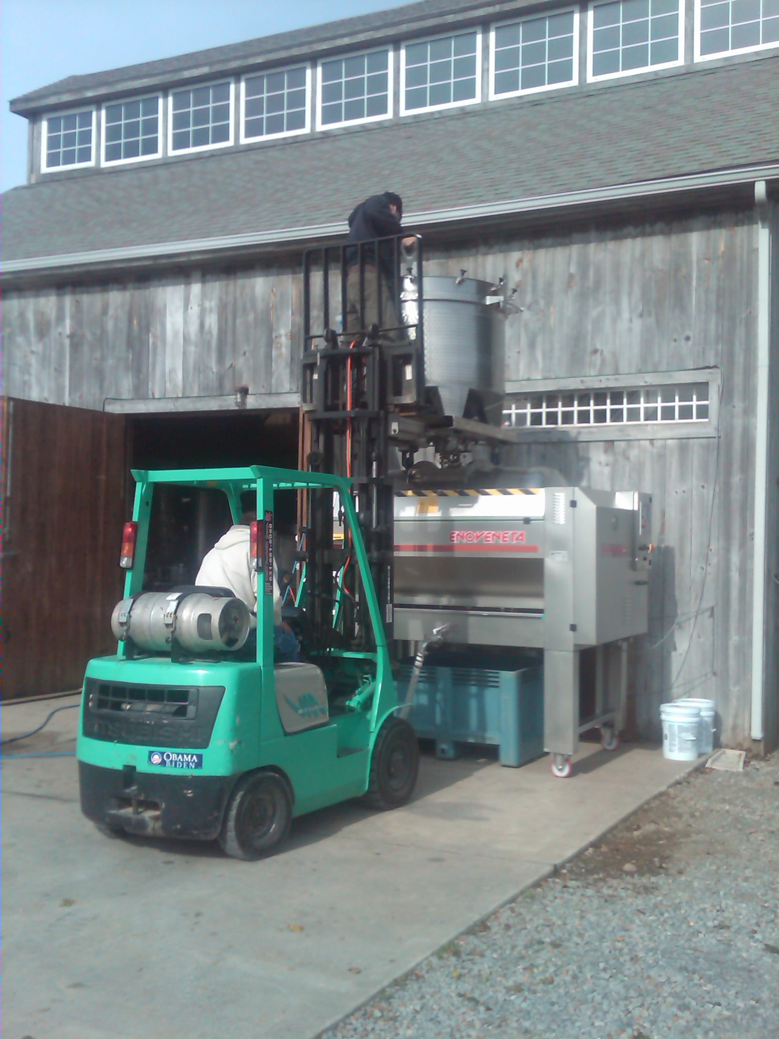 This Pinot Blanc is the first time Shinn Estate Vineyards will release. It will be a barrel fermented wine. The brix, which is measurement of the dissolved sugar-to-water mass ratio of a liquid, came in at 23.8. The fruit was wonderful, I stole a few berries that bounced my way as David and I gently dropped the fruit into the destemmer. Anthony and David then used a fork lift to allow gravity to work and have the fruit fall into a wine press. The juice was then place into a stainless steel tank. From there it will go into oak barrels to ferment for a while. This was exciting and I cannot wait to taste this when it is ready, in a few years.