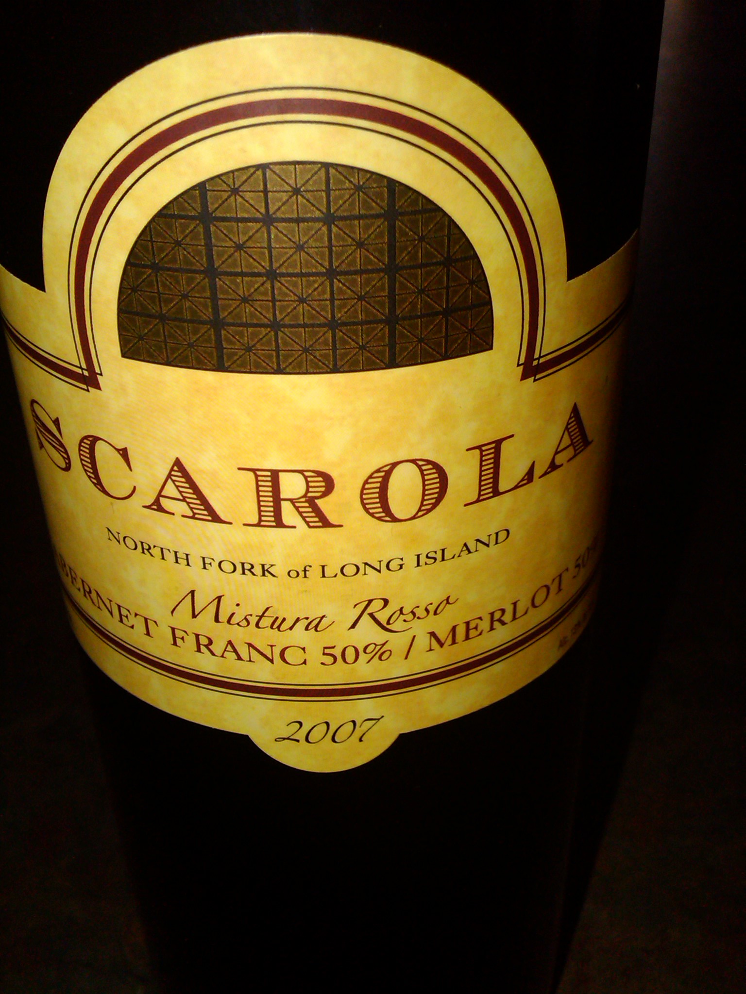 Frank then opened a bottle of his 2005 “Messeria” Merlot. Massera, means family farm in italian. Frank family is from Italy and he only came here to America in 1960. He keep his wine close to his heart and makes it in the old world style his family would have made it in Italy. The lable of Scarola Wins also pays hommage to his family’s arrival in the new world, America. The Goden Arch you see is reminiscent of teh arch at Ellis Island, where his family came through.