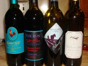 The winning wine that night was, Red Newt Wine Cellars 2007 “Sawmill Creek” Cabernet Franc. It was also the most expensive of the night at $39.00. The runner up was Hazlitt 1852 Vineyards 2007 Cabernet Franc, which is retailing at $22.00 probably would offer you the best value, while offering you decent quality. Fox Run Vineyards 2007 Cabernet Franc/Lemberger took the bronze medal, despite the fact that this was more Lemberger than Cabernet Franc in the bottle. It is not released yet and the 2006 vintage is selling for $15. This could be my new everyday table wine though. And last on the list was the Rooster Hill Vineyards 2007 Cabernet Franc. This too is not released yet, but, will sell for about $20.00. It was a nice wine, I just could not get past the smoky bacon.