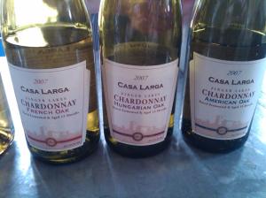 Here are my tasting notes: 2007 American Oak Chardonnay: Butter and toasty with some apple.  Spice and wood.  Creamy.  The 2007 Hungarian Oak Chardonnay: More fruit than the last, more apple and melon, lighter body. woodsy.  The 2007 French Oak Chardonnay: Buttery and toasty.  Overwhelming.  Spice.  Some apple, not much else.  Seemed to have a bit more acidity.  A touch of herbaceousness.