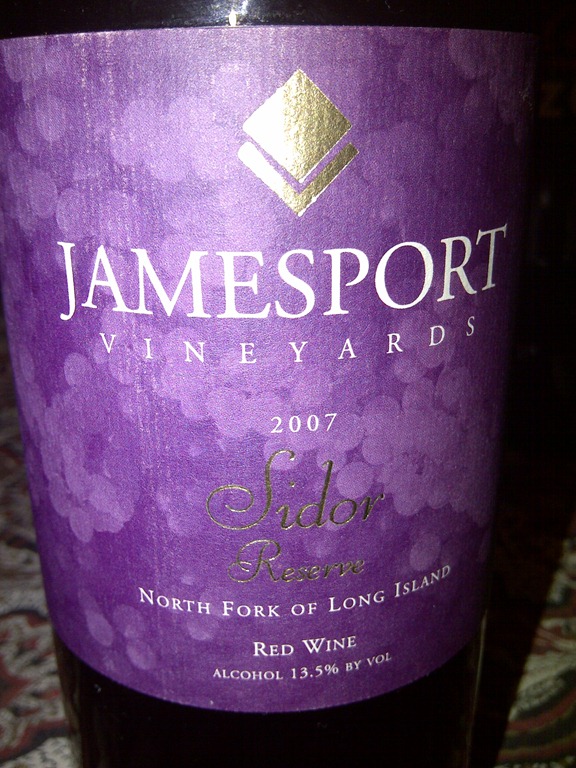 The Jamesport Vineyards 2007 “Sidor” Reserve Syrah ($45) does not have any Viognier in it, but not to worry, it still is worth every penny. A blend of 62% Syrah, 18% Cabernet Sauvignon, 9% Cabernet Franc, 9% Merlot, 2% Petit Verdot captures the 2007 vintage beautifully. This reserve named “Sidor” because it comes from their Sidor farm in Mattituck.